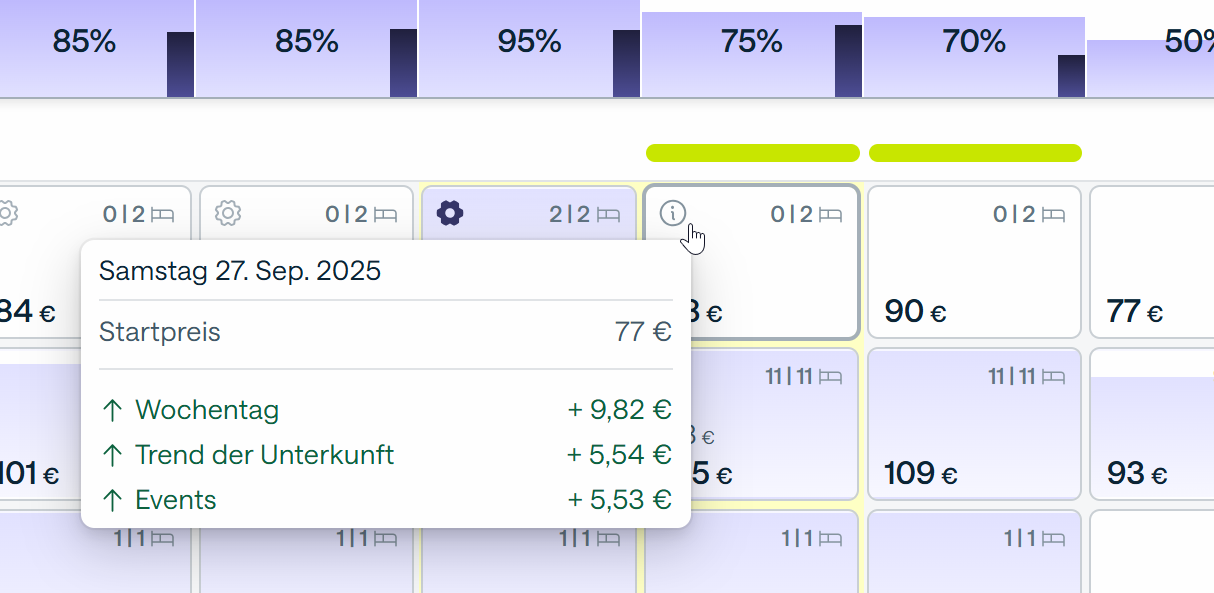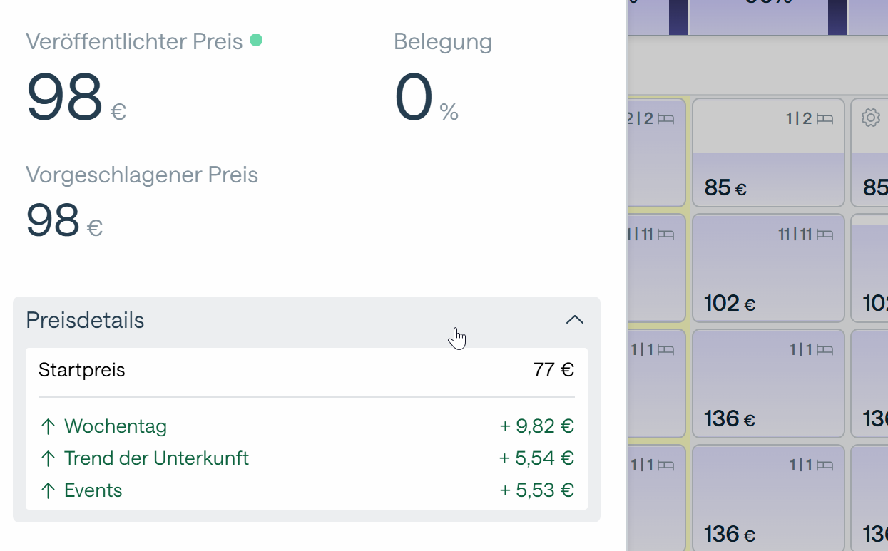 Die Preisbegründungen zeigen die verschiedenen Faktoren, die zur Bestimmung des optimalen Verkaufspreises Ihrer Zimmer gemäß Smartpricing beitragen.