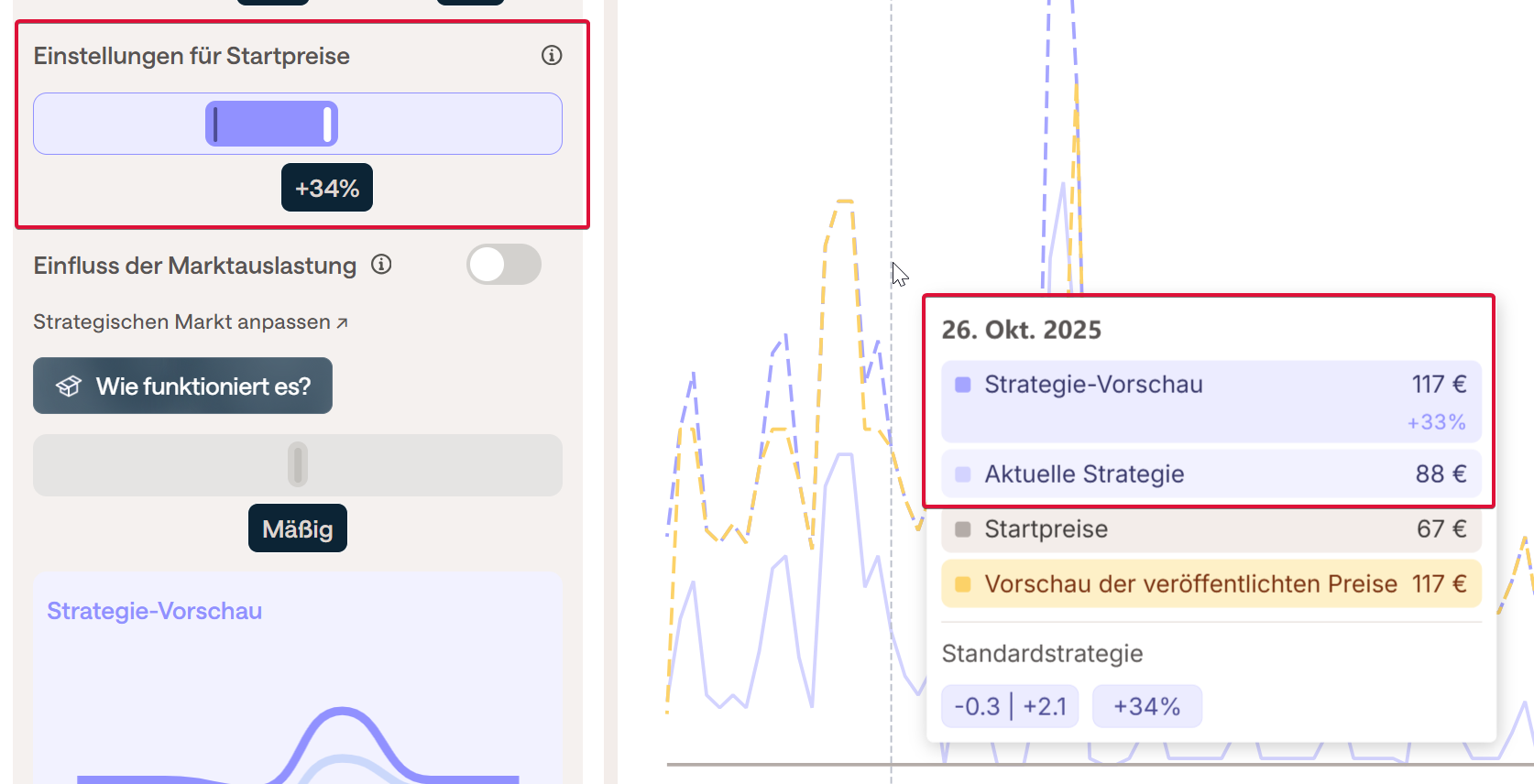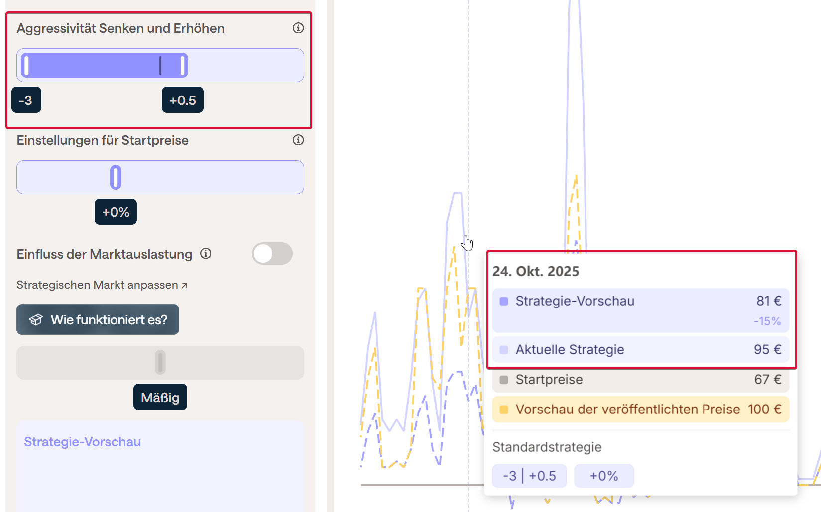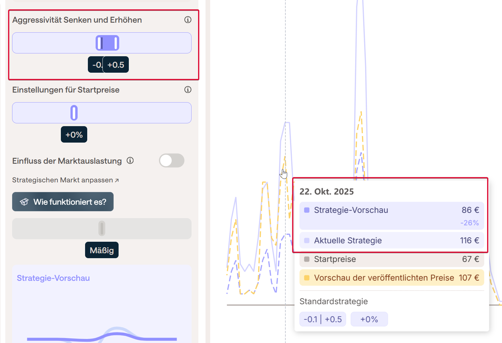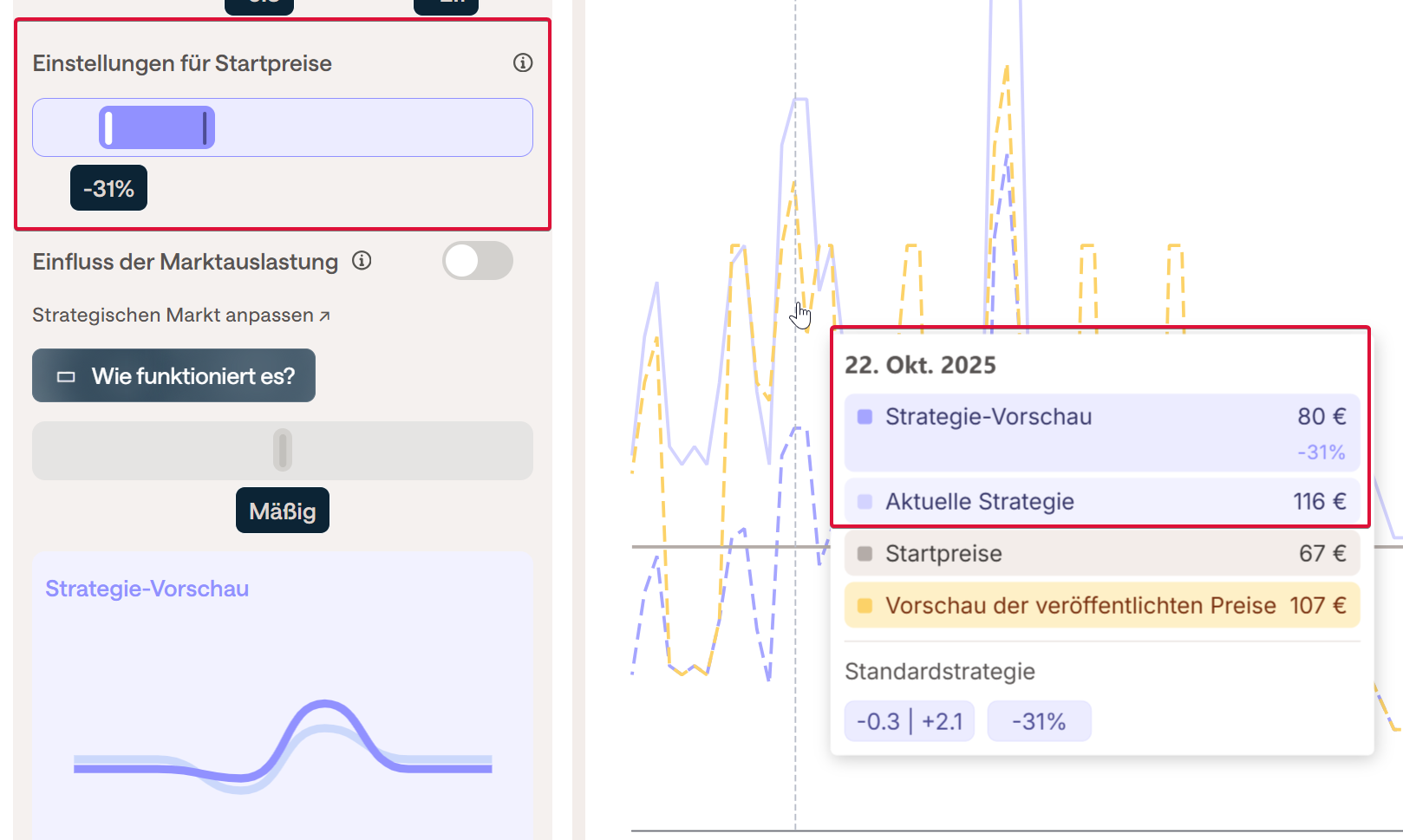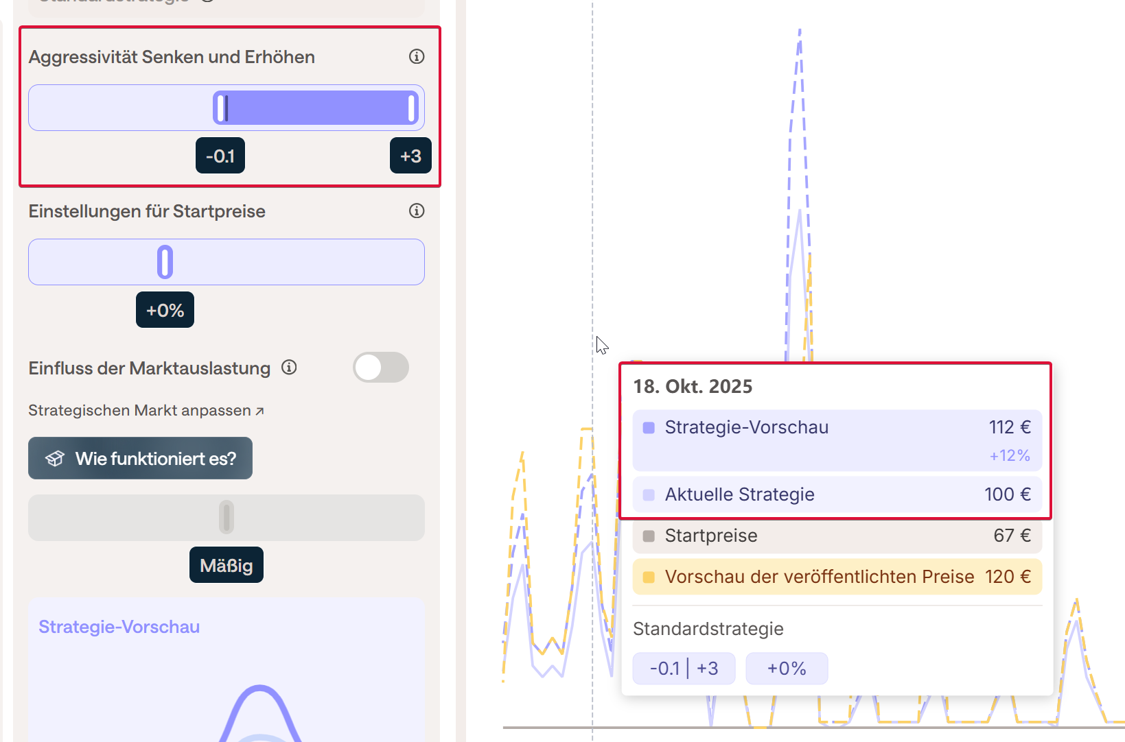 Jede Änderung kann vor dem Speichern im Diagramm Preisentwicklung rechts neben den Einstellungen überprüft werden, indem man die Maus auf dem Diagramm zum gewünschten Datum positioniert und die Aktuelle Strategie (vor den Änderungen) mit der Strategie-Vorschau (nach den Änderungen) vergleicht.