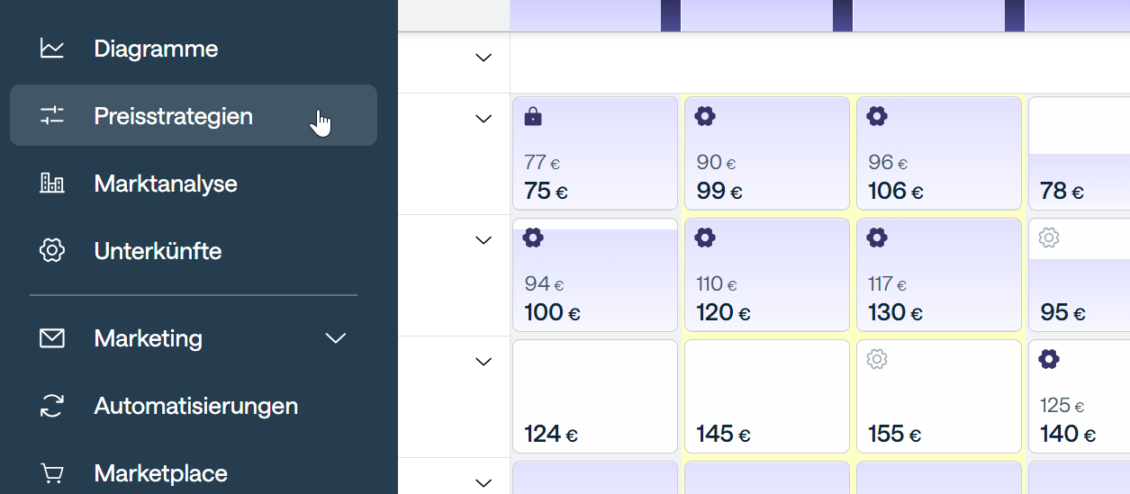 - nach rechts steigen die Startpreise aller Einheiten der ausgewählten Unterkunft und folglich verschiebt sich die gesamte Strategie nach oben.