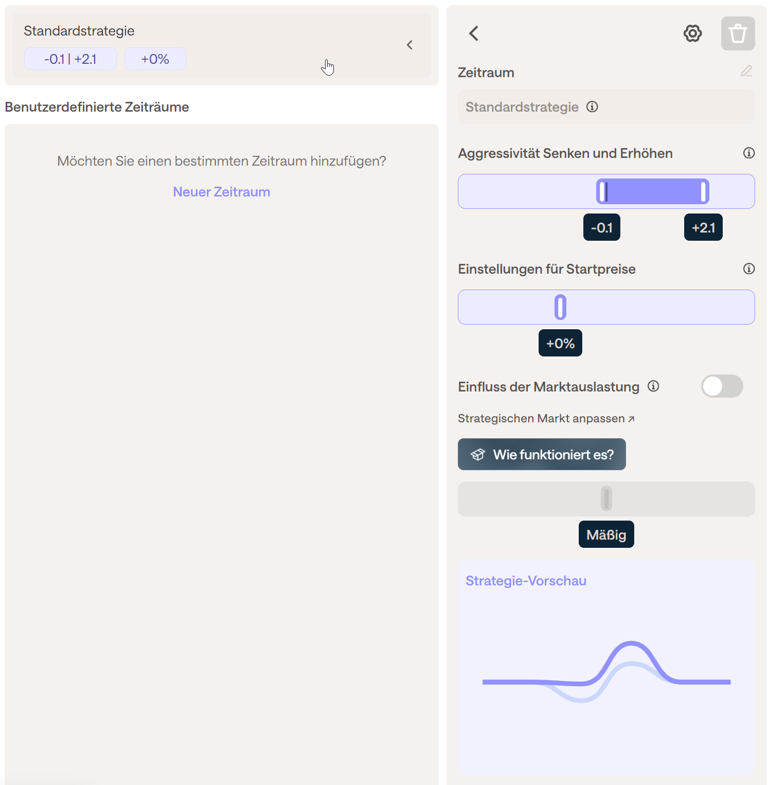 Wenn die Auslastung niedrig ist, sinken die Preise. Wenn Sie die vorgeschlagenen Preise weniger stark senken möchten, als es die Standardstrategie (mit der Einstellung -1) tun würde, können Sie dies tun, indem Sie den Schieberegler von beispielsweise -1 auf -0,5 bewegen. Auf diese Weise wird der vorgeschlagene Preis höher sein als der der Standardstrategie.