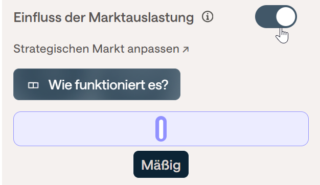 Der letzte Schieberegler des Abschnitts beeinflusst die Auswirkung der Marktauslastung auf die Strategie. Mit anderen Worten, wenn Ihre Auslastung geringer ist als die des Marktes, sinken die Preise; ist sie höher, steigen die Preise, um die Einnahmen zu optimieren. Die Standardeinstellung ist Moderat, aber Sie können den Einfluss der Marktauslastung verringern oder erhöhen, indem Sie den Schieberegler nach links oder rechts bewegen; Sie können außerdem entscheiden, den Einfluss der Marktauslastung mit dem unten gezeigten Schalter vollständig zu deaktivieren.