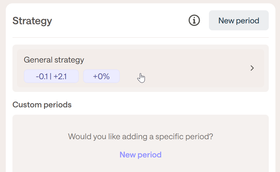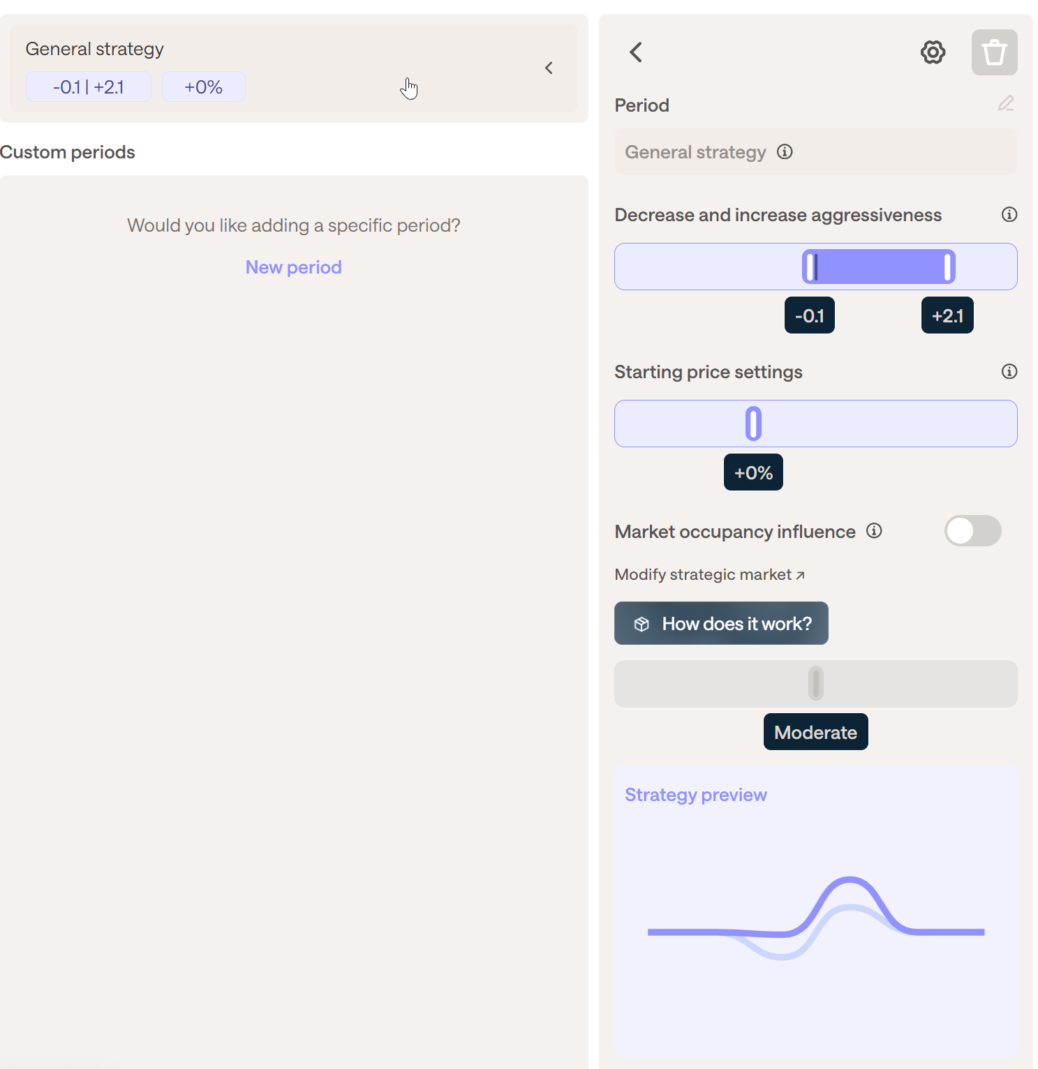 By default, on the page, you will find the general strategy, set to -1, +1, and 0% (unless this has already been modified), for decrease, increase, and starting prices. This is the active strategy for all periods of the year, excluding those set in the Custom Periods, which we will see below.