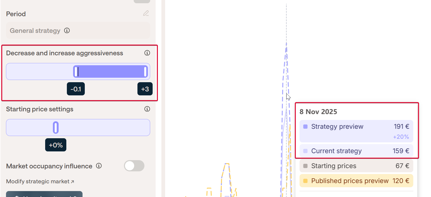 When occupancy increases, prices increase. If you wish to increase the suggested prices more than the default strategy would (which has a +1 setting), you can do so by moving the slider from e.g., +1 to +3. This way, the suggested price will be higher than that of the default strategy.
