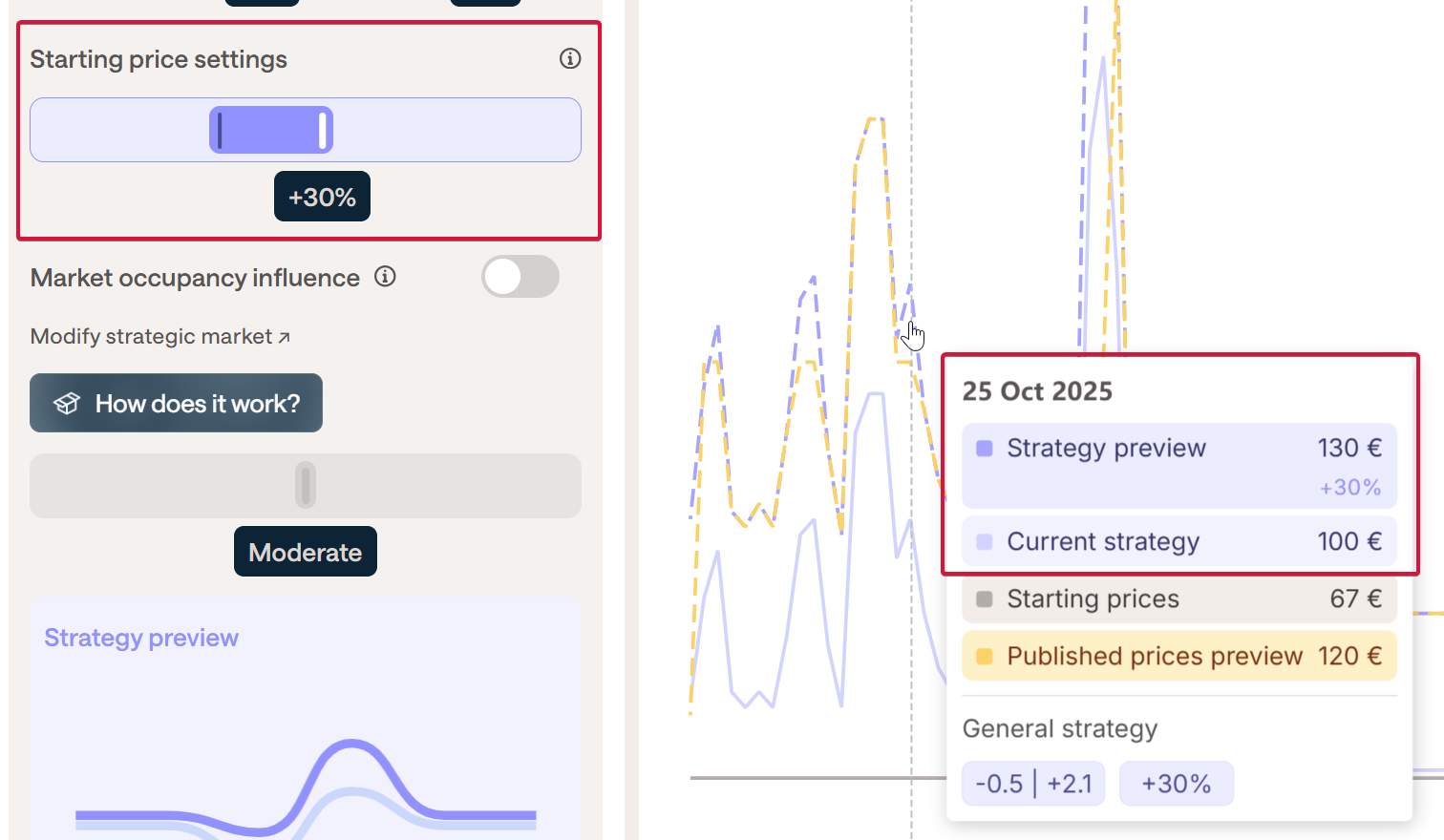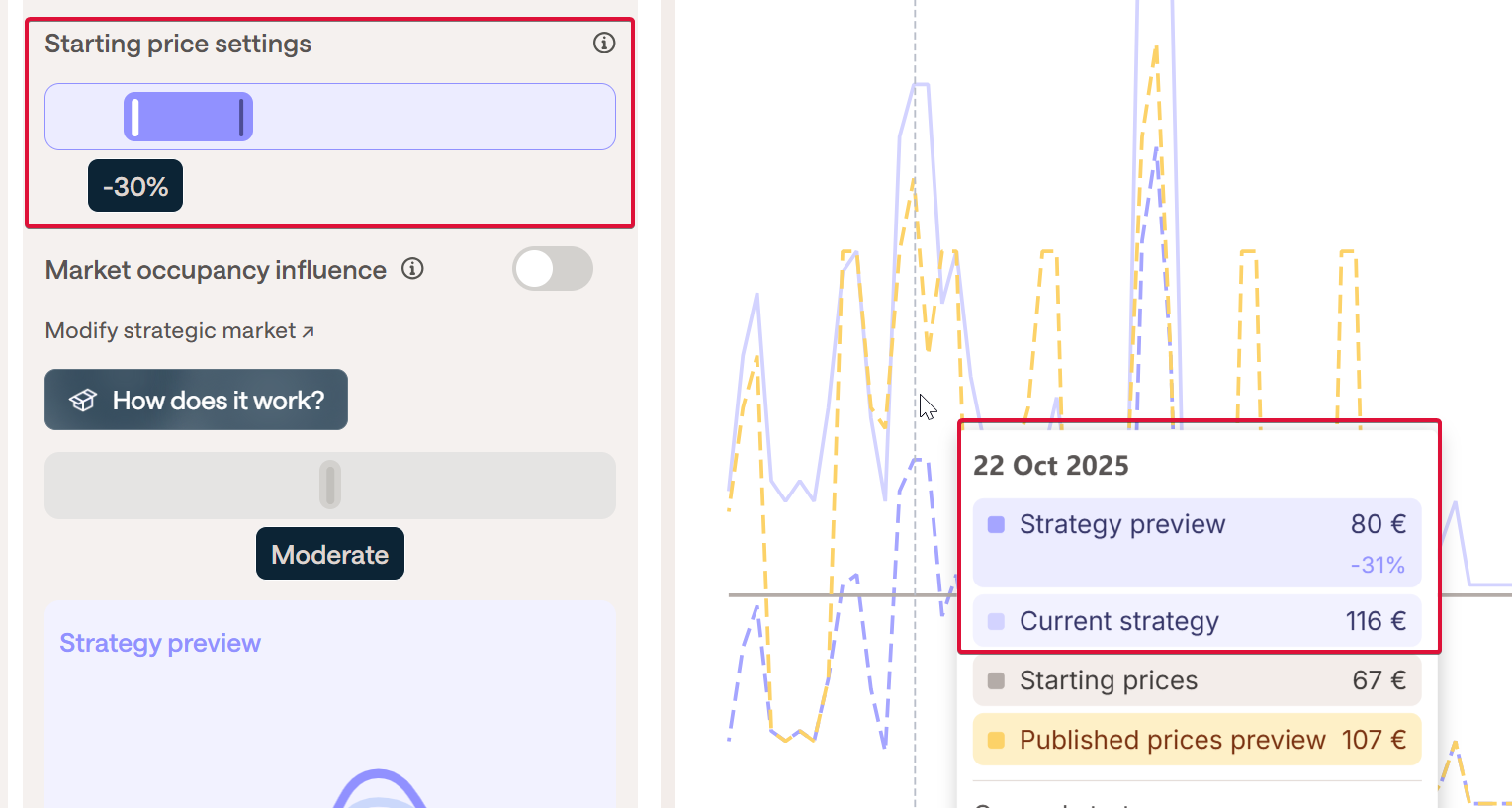 Each change can be verified before saving in the Price Trend graph on the right of the settings, by hovering the mouse over the graph at the desired date and comparing the Current Strategy (before changes) with the Strategy Preview (after changes).