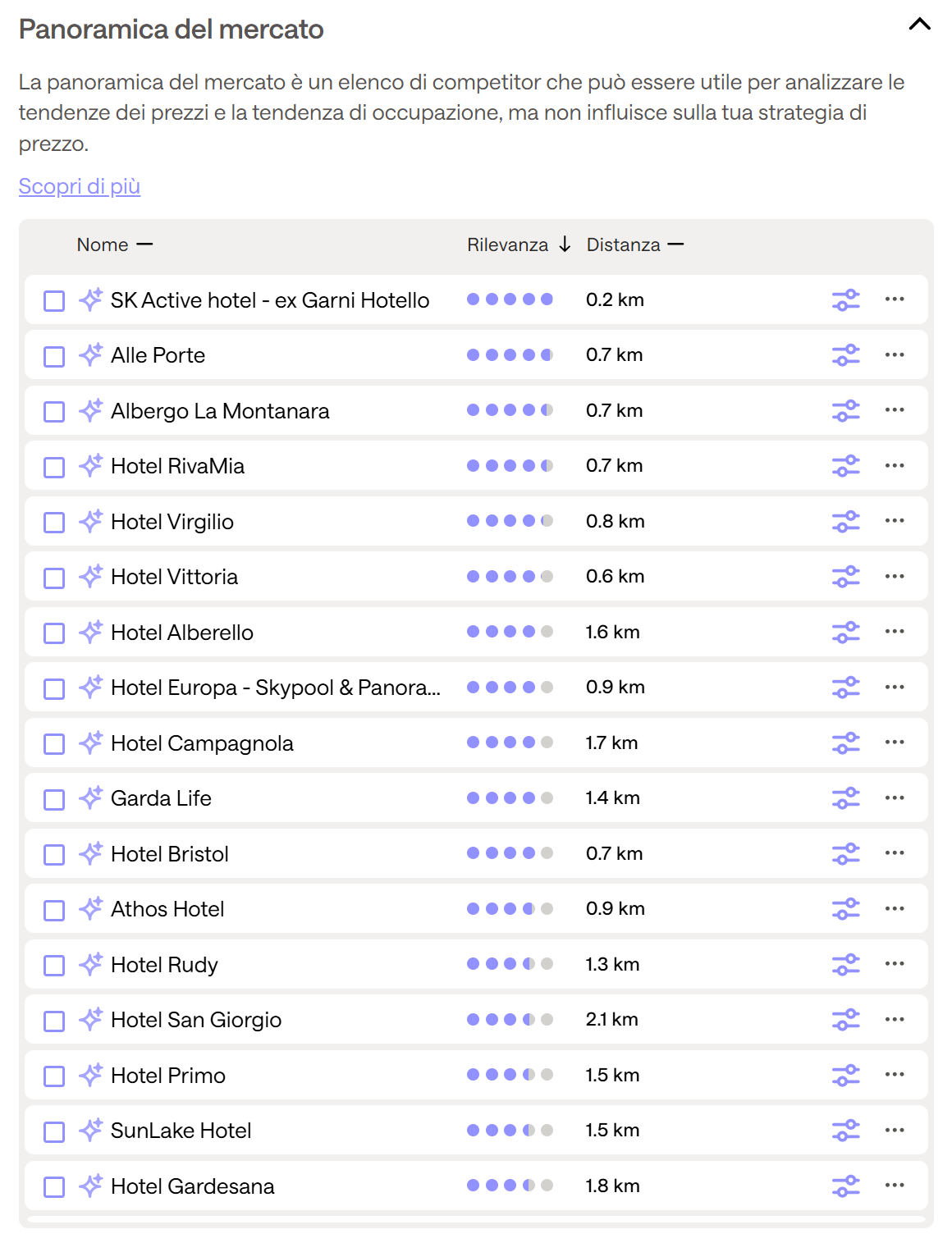 In fase di Onboarding, Smartpricing calcola automaticamente l'elenco dei tuoi potenziali concorrenti analizzando vari fattori, tra cui la posizione geografica, il tipo di proprietà, le recensioni online, i servizi offerti e la stagionalità. Il software monitora costantemente le fluttuazioni di mercato e rinnova l'elenco dei concorrenti quotidianamente per garantire che le informazioni siano sempre aggiornate.