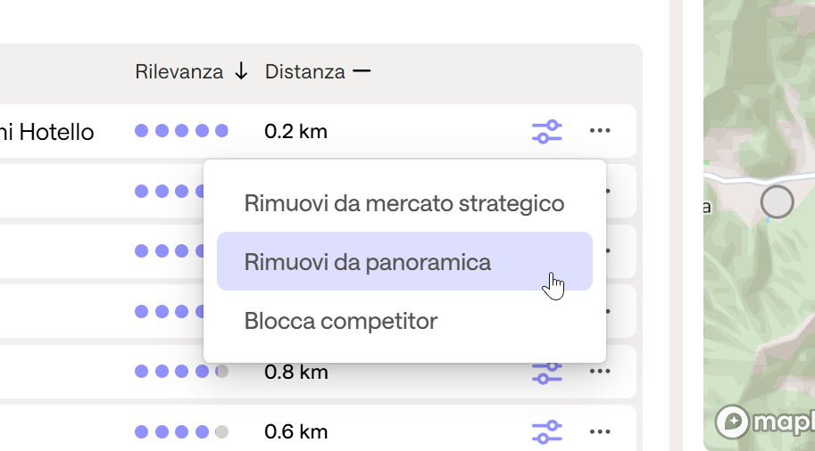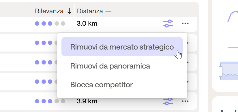 Puoi rimuovere dei competitor da una lista specifica cliccando sui 3 puntini alla destra di ogni riga (...), poi selezionando Rimuovi da panoramica o Rimuovi da mercato strategico in base alle modifiche necessarie.