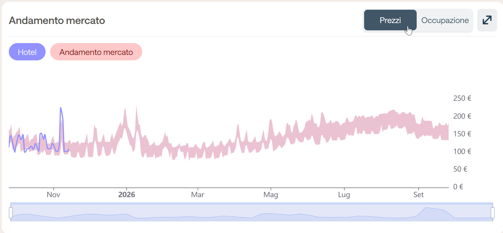 Il grafico Prezzi mostra l'andamento dei prezzi del mercato di riferimento selezionato nella Panoramica, proveniente da Booking.com, creando una fascia di prezzo (in rosa), con la quale viene paragonato il vostro prezzo, sempre da Booking.com, in blu.