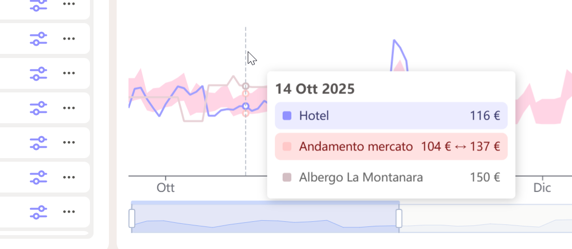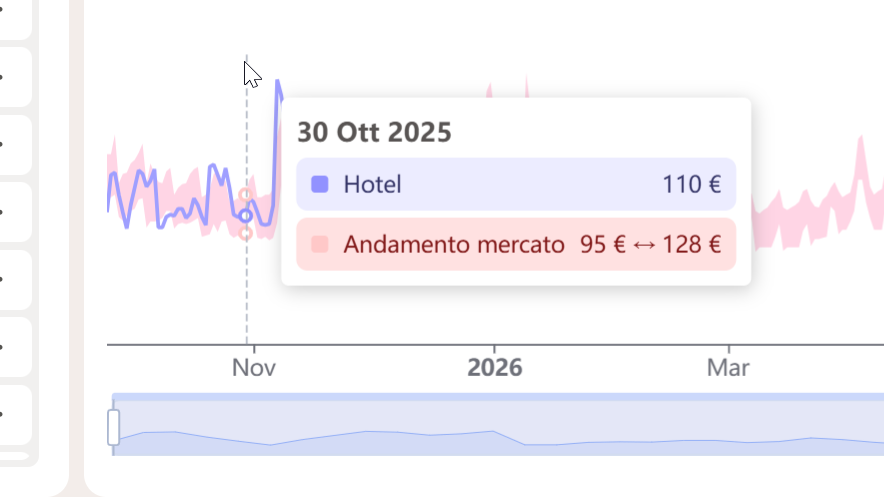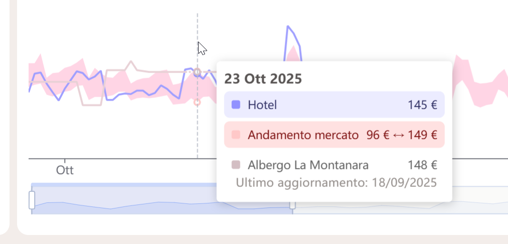 I prezzi dei competitor possono apparire con una linea spezzata, quindi con dei salti, questo significa che le tipologie non sono in vendita su Booking.com per quelle date. Inoltre possono apparire anche a puntini, questo significa invece che i prezzi non sono aggiornati da almeno 3 giorni da parte del competitor. La data di aggiornamento è visibile posizionando nuovamente il cursore sulla pagina.