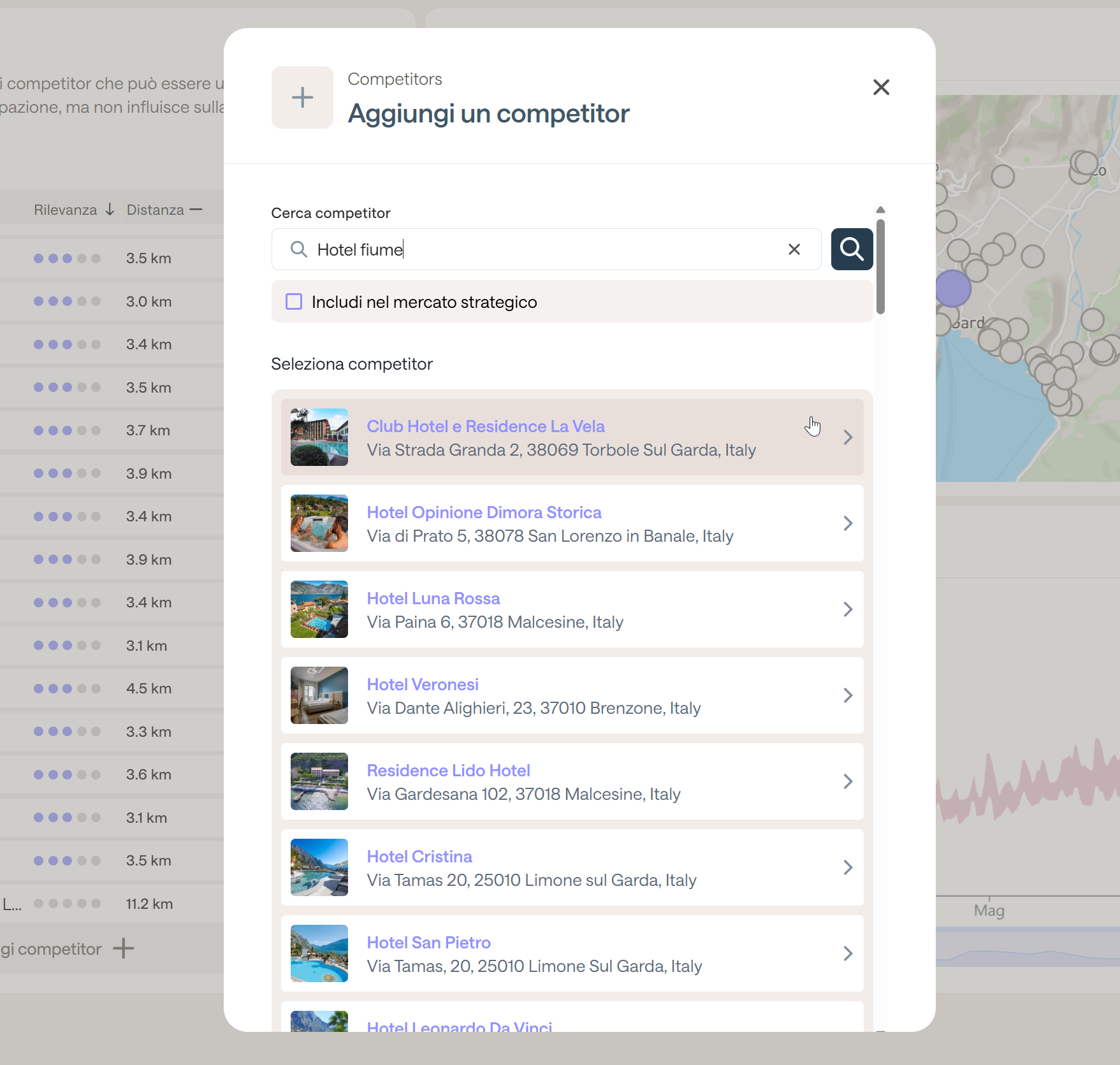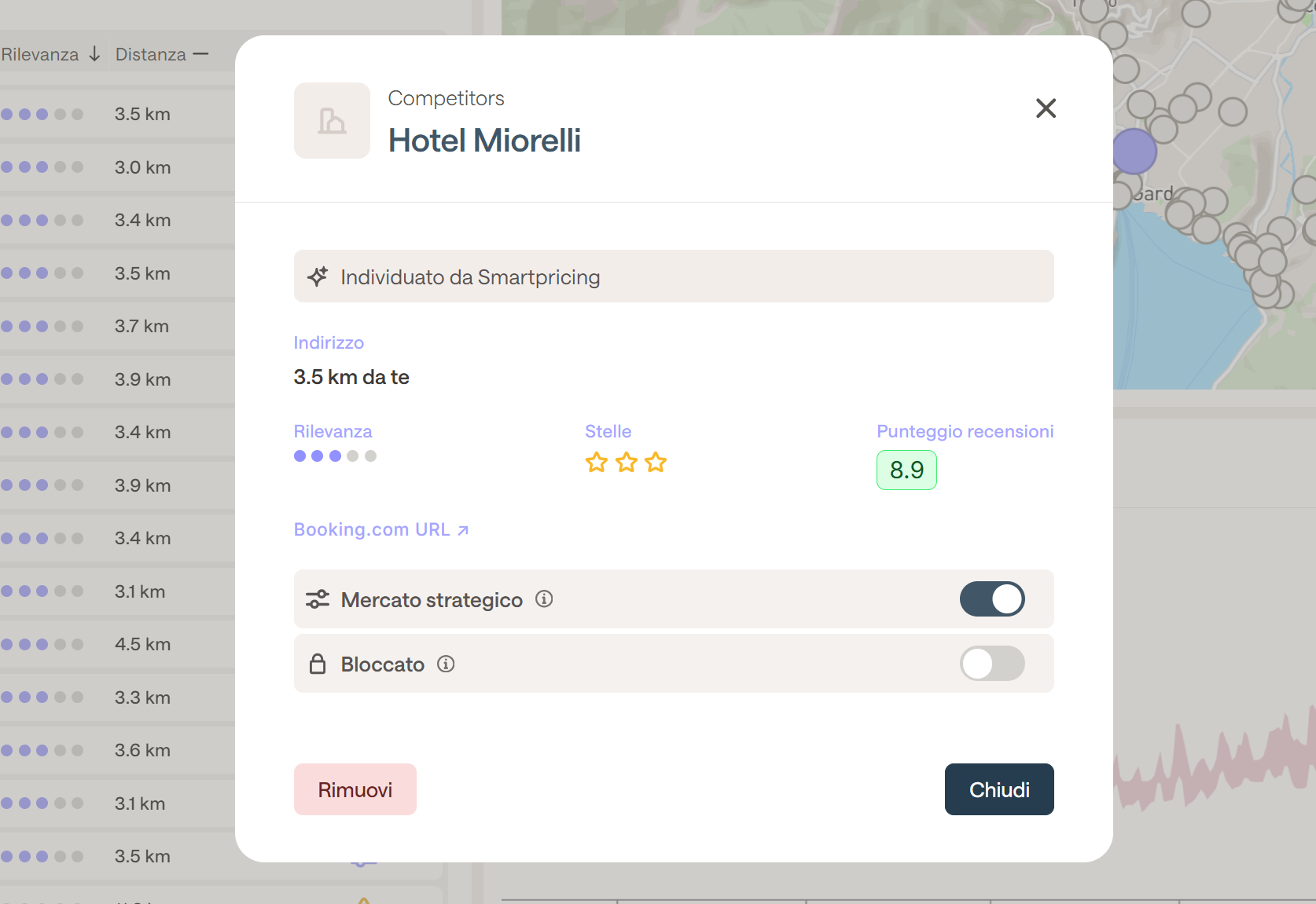 L'elenco classifica i potenziali concorrenti dal più significativo al meno significativo e indica anche la media delle recensioni raccolte sulle piattaforme OTA. Qui è possibile visualizzare il dettaglio di ogni competitor cliccando sopra il loro nome per visualizzare tutte queste informazioni aggiuntive.